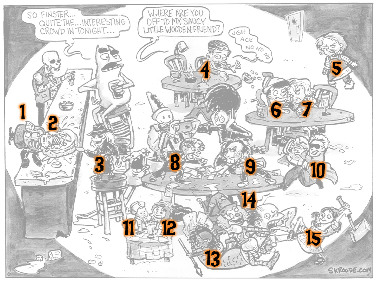 At Finster’s tonight it’s attack of the scary dolls and doll related entities. Who are these strange, stunted spooks? I AM GLAD YOU ASKED AS HERE IS A HANDY KEY I MADE FOR YOU BECAUSE I CARE FOR YOU SO VERY VERY MUCH:
